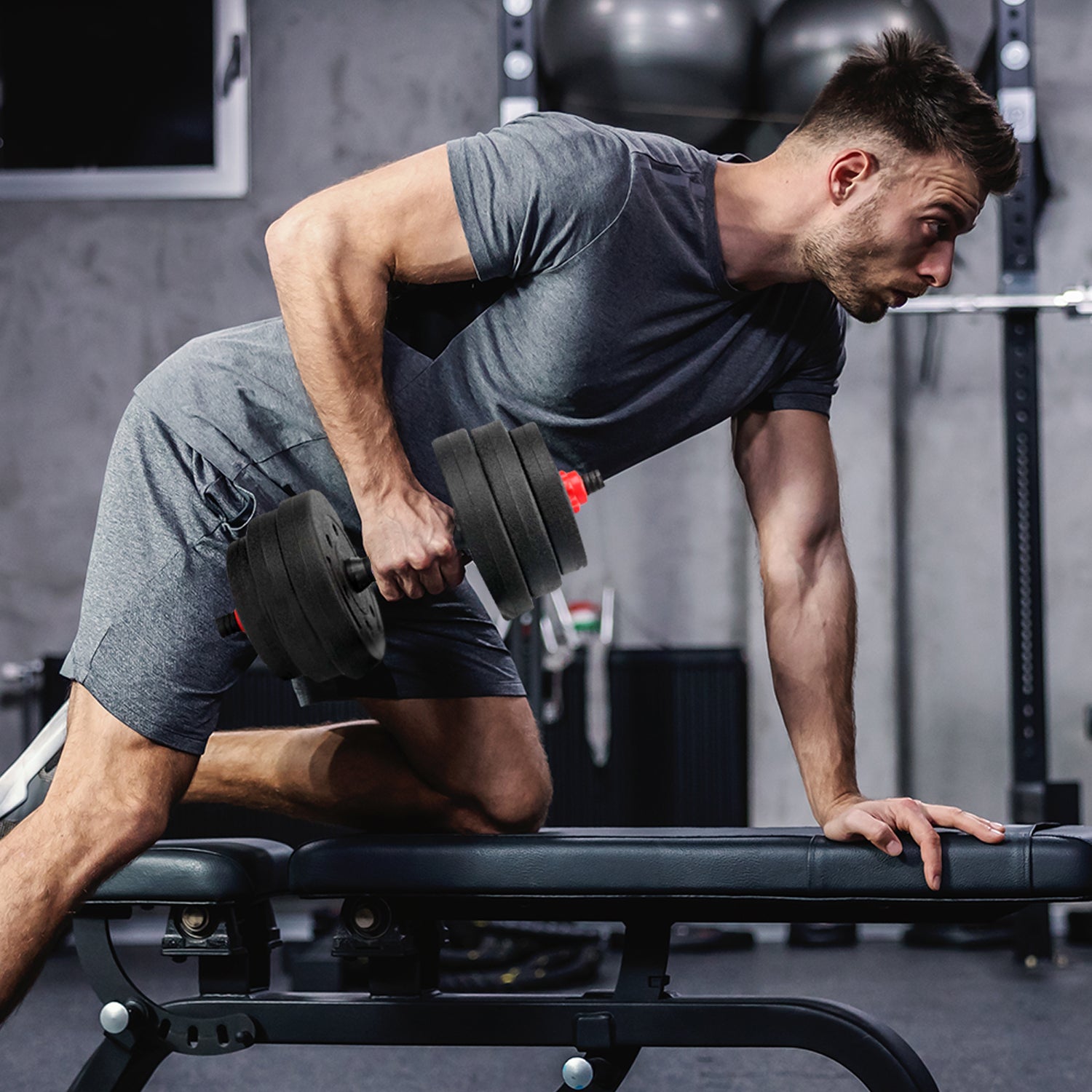Set de mancuernas y barra convertible, ideal para iniciar tu propio gimnasio en casa. Este set está diseñado para realizar numerosos ejercicios de musculatura, trabajando bíceps, tríceps, deltoides, pectorales, entre otros.