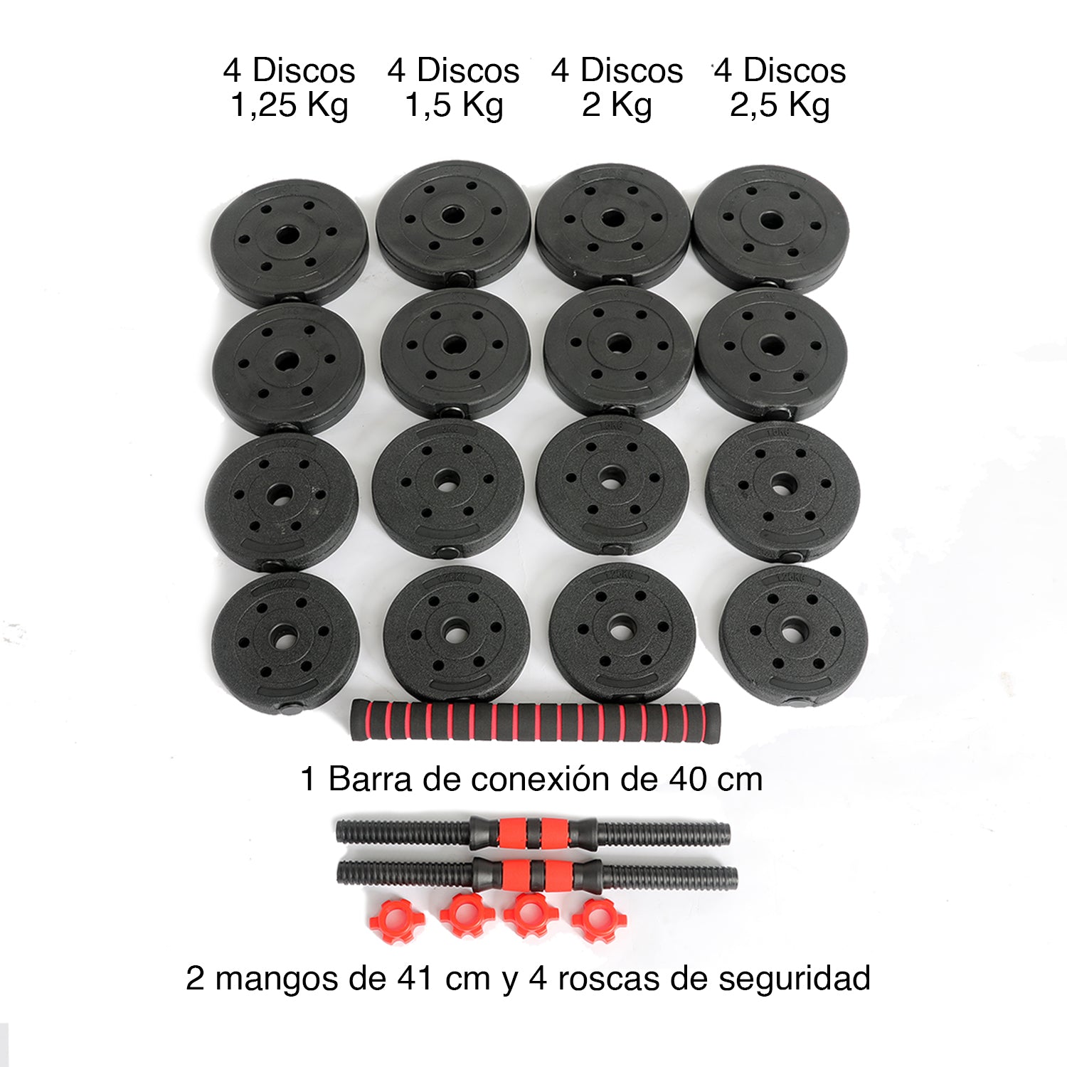 De forma muy fácil y rápida podrás convertir una barra con pesas a una mancuerna, según tus necesidades. Incluye 16 discos de arena recubiertos en PVC, roscas de seguridad para un bloqueo seguro de los discos y una barra ergonómica antideslizante. ¡Es el complemento perfecto para tu rutina de ejercicio!