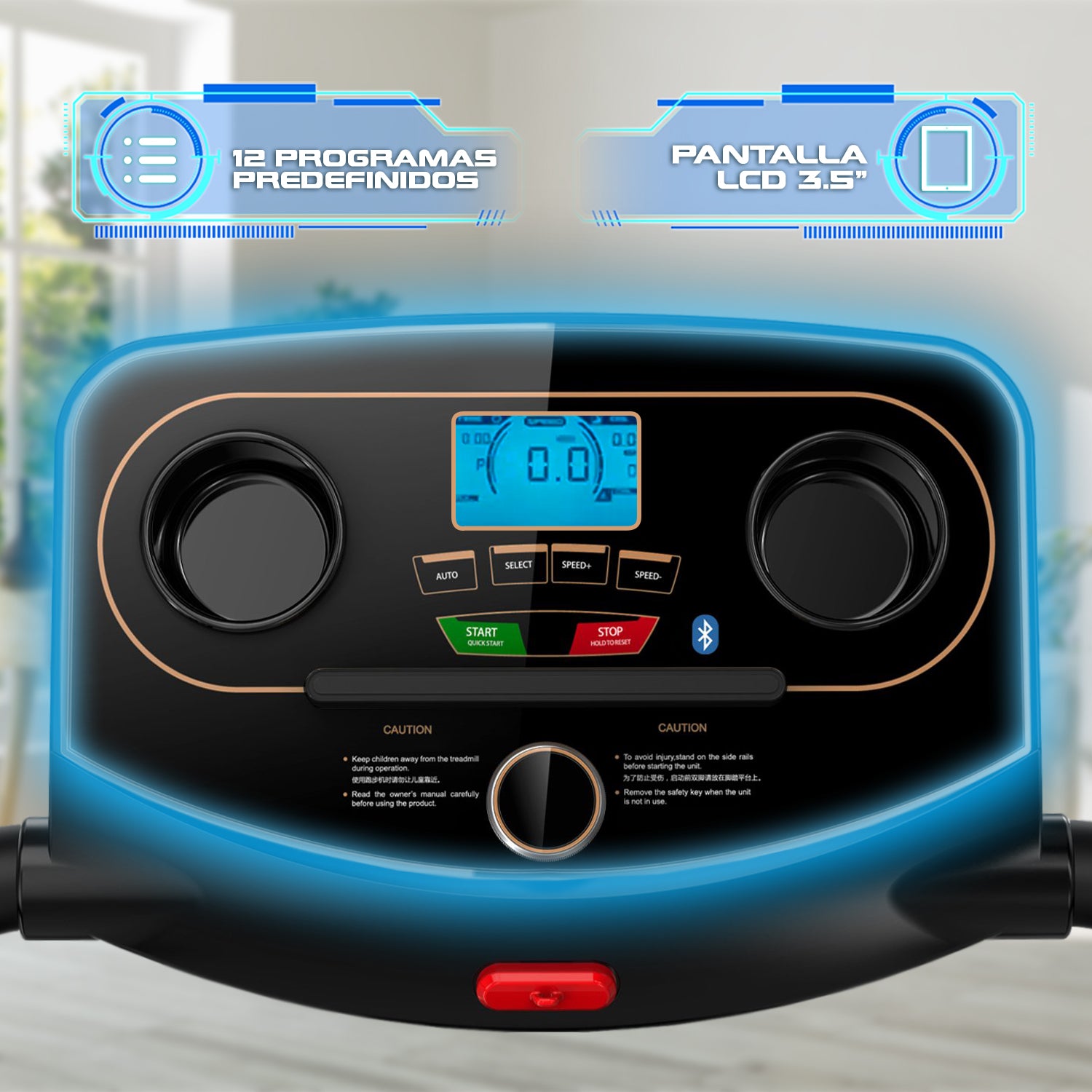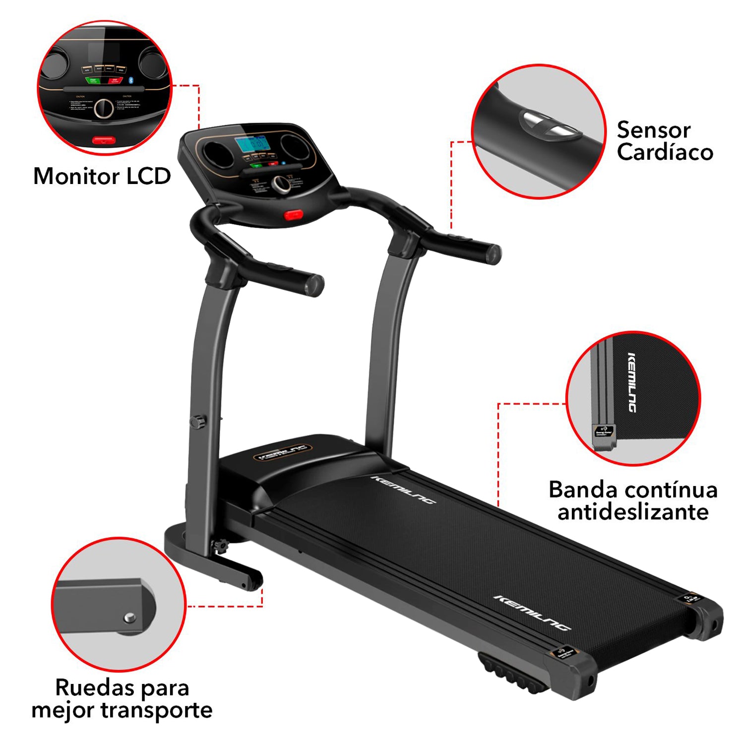 Gracias a su pantalla LCD de 3,5” puedes monitorear velocidad, distancia, tiempo y pulso mientras entrenas. Además, incorpora sensor de pulso, bluetooth y parlantes para que disfrutes de tu música favorita, manteniendo alta la motivación durante cada sesión. Incluye llave de seguridad y sistema de detención automática para mayor protección.